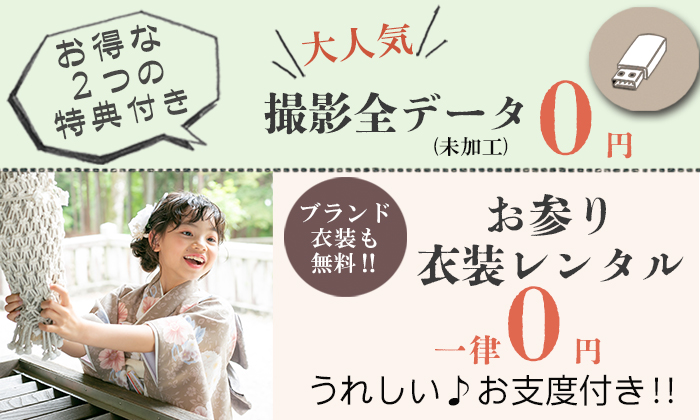 和装も洋装も着たい!家族全員着物を着ていろいろ撮影したい!撮影した後にすぐお参りは疲れてご機嫌が心配💦そんな方にはお参りレンタルが最大0円になるとってもお得な2dayプランがおすすめ!もちろんお参りしなくても各種アイテムは利用できますよ♪