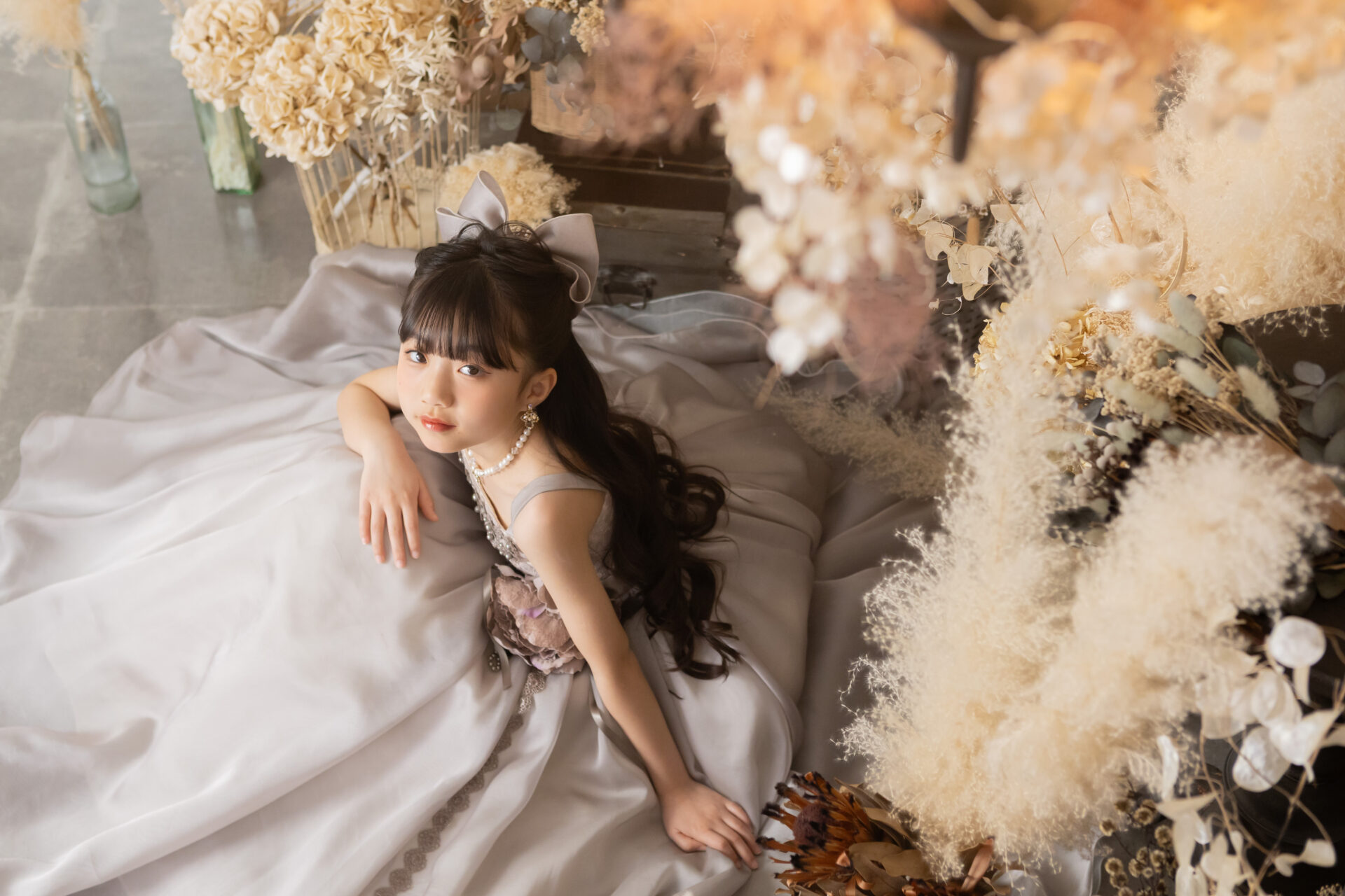 ドライフラワーとアンティーク小物のこだわりのスタジオ。形に囚われない何げない姿を撮影します。広い空間を利用した写真はまるで雑誌の1ページのよう。