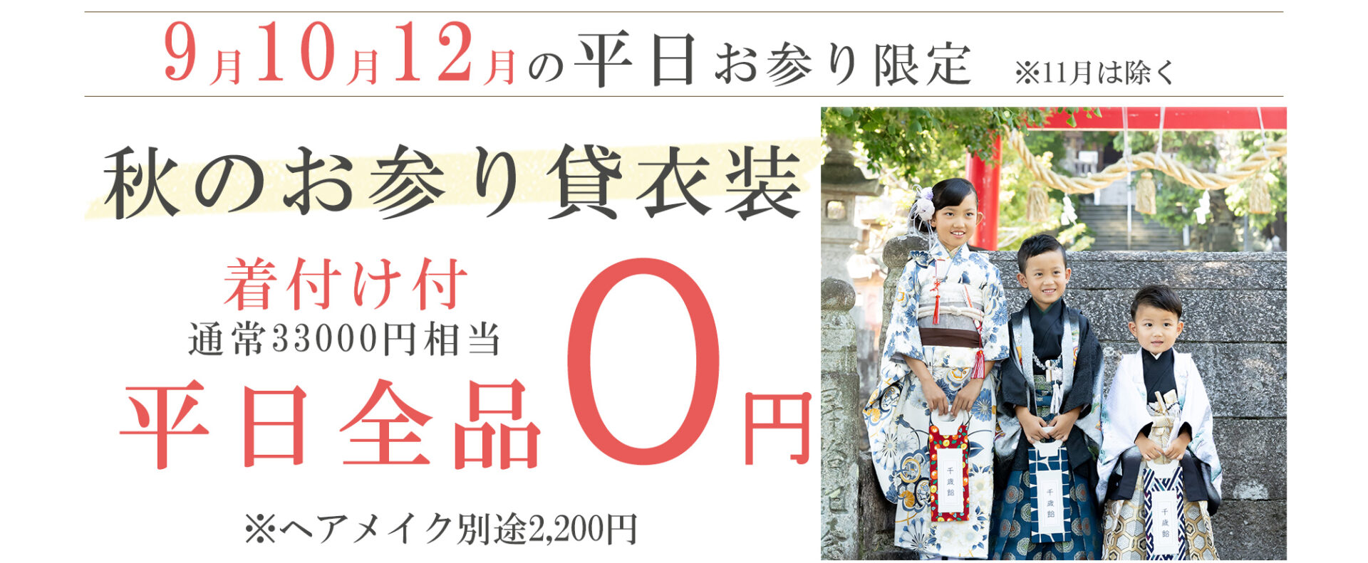 ・お参りに同行するプランではありません。10~ 12 月は平日のみの撮影です。 撮影場所の指定はできません。ご自身の車でご移動いただきます。 雨天の場合、平日の場合日延べ可能。天気による日延べ希望の場合は前日の17時までにお申し出ください。 土日祝撮影の場合日延べ不可。館内の撮影に変更して撮影となります。