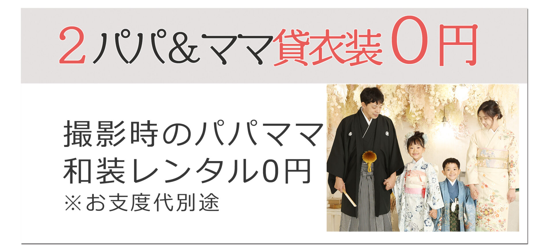 主役はもちろんパパ&ママの和装やご兄弟の和&洋装が撮影時レンタル無料です。家族みんなで素敵な思い出を残しましょう。※お支度代別途